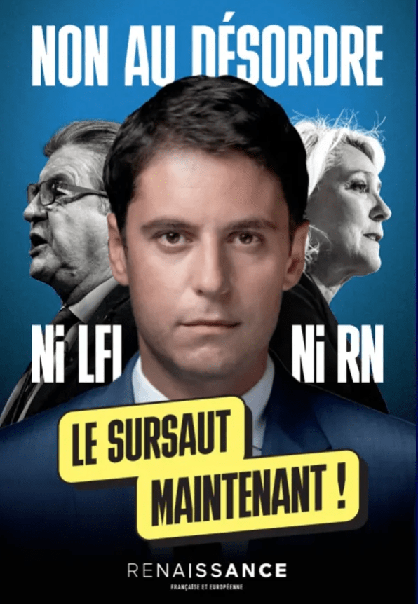 Que pensez-vous de l’affiche récente du parti Renaissance ? Le fait qu’Attal se positionne à l’instar de Macron comme l’alternative entre LFI et le RN est-il un bon positionnement politique ?