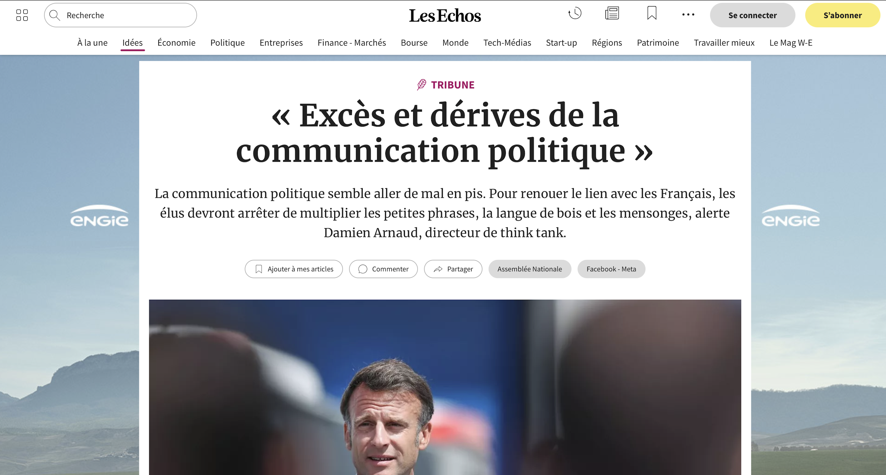 Abus de petites phrases, triomphe de la langue de bois, mensonges… dans cette tribune publiée sur le site du journal Les Echos (réservé aux abonnés), Damien Arnaud détaille, selon lui, les 10 principales dérives de la communication politique : https://www.lesechos.fr/idees-debats/cercle/exces-et-derives-de-la-communication-politique-2174664.